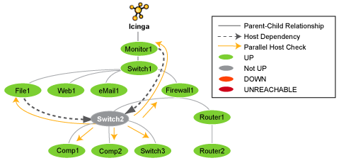 Sie werden auch feststellen, dass Switch2 von Monitor1 und File1 in Bezug auf Benachrichtigungen oder Prüfausführung abhängt (welches davon ist unwichtig für dieses Beispiel). Wenn vorausschauende Host-Abhängigkeitsprüfungen aktiviert sind, wird Icinga parallele Prüfungen von Monitor1 und File1 sowie gleichzeitig für die direkten Eltern und Kinder von Switch2 auslösen. Icinga tut dies, weil es wei�, dass es die Abhängigkeitslogik in der nahen Zukunft prüfen muss (z.B. für Zwecke der Benachrichtigung) und es will sicherstellen, dass es die aktuellsten Statusinformationen für die Hosts hat, die an der Abhängigkeit beteiligt sind.