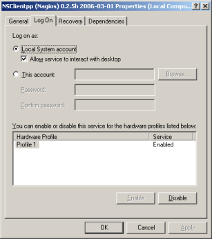 5. Öffnen Sie die Dienste-Applikation und stellen Sie sicher, dass der NSClient++-Dienst mit dem Desktop kommunizieren darf (Reiter "Anmelden", Häkchen bei "Datenaustausch zwischen Dienst und Desktop zulassen" gesetzt). Setzen Sie ggf. das Häkchen.