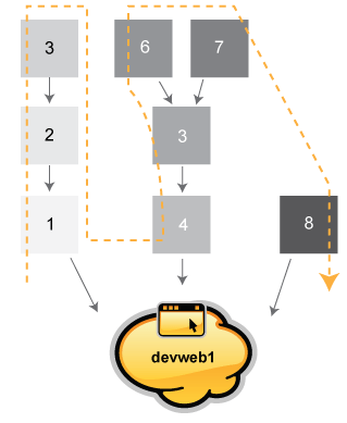 Im obigen Beispiel erbt devweb1 Variablen/Werte von zwei Quellen: generic-host und development-server. Sie werden bemerken, dass in beiden Quellen eine check_interval-Variable definiert ist. Weil generic-host die erste in devweb1 durch die use-Direktive angegebene Vorlage ist, wird der Wert für die check_interval-Variable durch den devweb1-Host vererbt. Nach der Vererbung sieht die Definition von devweb1 wie folgt aus: