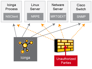 Ihr Überwachungsrechner sollte als eine Hintertür in Ihre anderen System betrachtet werden. In vielen Fällen wird dem Icinga-Rechner der Zugriff auf Firewalls gewährt, um entfernte Server zu überwachen. In den meisten Fällen ist die Abfrage von verschiedenen Informationen der entfernten Server erlaubt. Überwachenden Servern wird ein gewisses Maß an Vertrauen entgegen gebracht, damit sie entfernte Systeme abfragen können. Das bietet einem potenziellen Angreifer eine attraktive Hintertür zu Ihren Systemen. Ein Angreifer könnte es einfacher haben, in Ihre Systeme einzudringen, wenn er zuerst den Überwachungsserver kompromittiert. Das trifft besonders dann zu, wenn Sie gemeinsame SSH-Schlüssel nutzen, um entfernte Systeme zu überwachen.