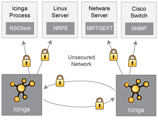 Sichere Kommunikationskanäle. Stellen Sie sicher, dass Sie die Kommunikationskanäle zwischen verschiedenen Icinga-Installationen und Ihren Überwachungskanälen verschlüsseln, wann immer möglich. Sie wollen nicht, dass jemand Statusinformationen belauscht, die über Ihr Netzwerk gehen. Diese Informationen können durch einen Angreifer genutzt werden, um die beste Zeit für einen unbeobachteten Zugang zu ermitteln.